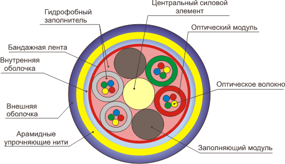 - наличие высокопрочных защитных покровов (арамидные нити) ,центрального элемента (стеклопластиковый пруток);
