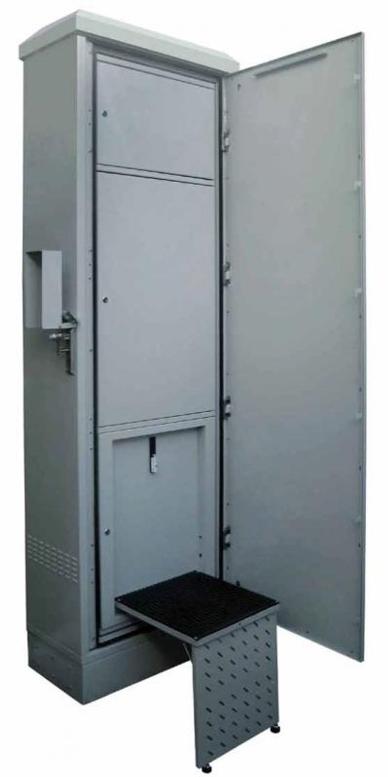 Шкаф оснащен внутренней дверью с откидной панелью - для защиты от атмосферных осадков во время проведения работ. Для удобства обслуживания оборудования, установленного в верхней части шкафа (от 46U), предусмотрена откидная ступенька с регулируемыми по высоте опорами (ножками).