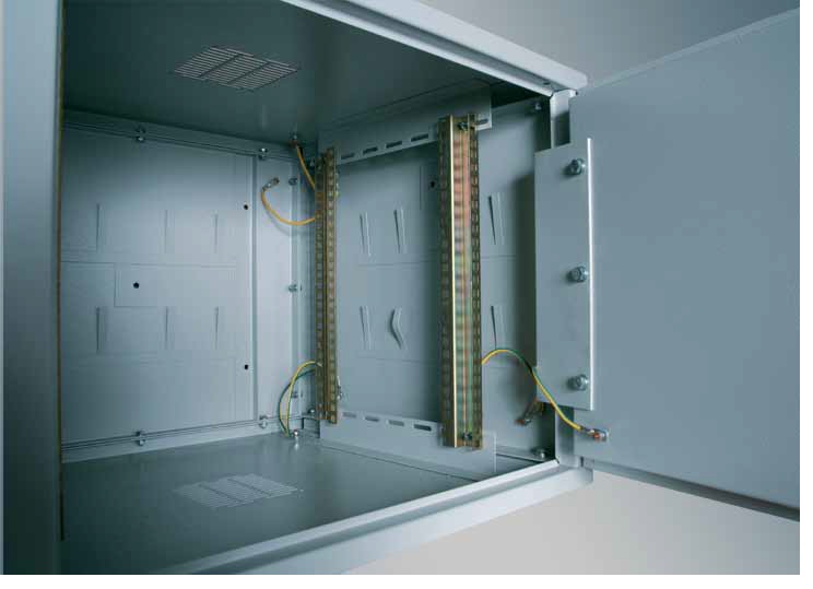 Заземление: Наличие заземляющих элементов на всех металлических частях шкафа. Возможность соединения комплектом заземления (желто-зеленый провод, сечением S=4) всех токопроводящих деталей конструкции. В основании предусмотрена точка подключения внешнего заземления шкафа.
