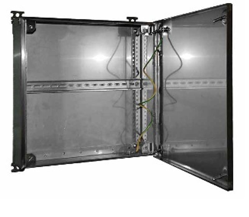 Шкаф оборудован монтажной панелью из оцинкованной стали толщиной 2мм, крепится четырьмя гайками на вварные шпильки задней стенки шкафа.