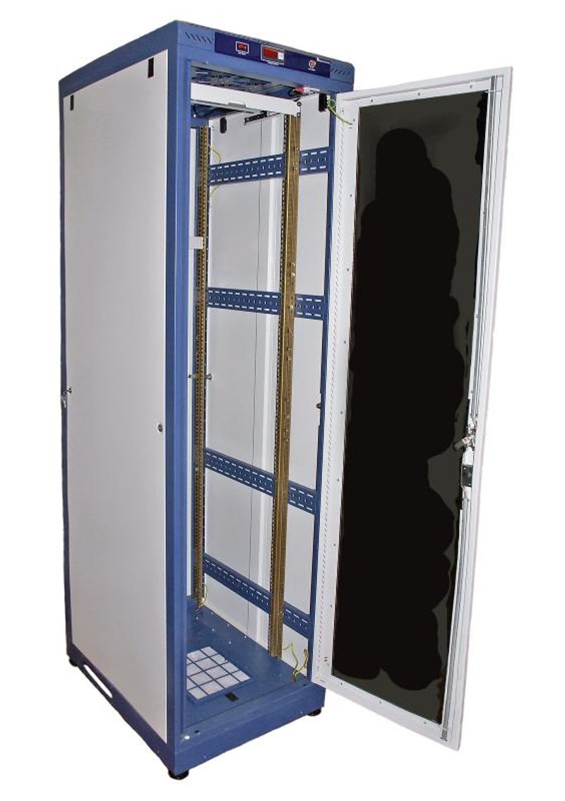Вентиляция и контроль климата. Перфорация в основании и крышке шкафа обеспечивает вентиляцию внутреннего объема шкафа. Поддержание необходимого температурного режима внутри шкафа обеспечивается 4-х вентиляторным блоком с электронным терморегулятором. Вентиляторный блок устанавливается в верхнюю крышку шкафа на выдвигающихся полозьях, регулятор температуры вынесен на торцевую поверхность блока. Это обеспечивает свободный доступ при обслуживании и позволяет более эффективно использовать рабочий объем шкафа.