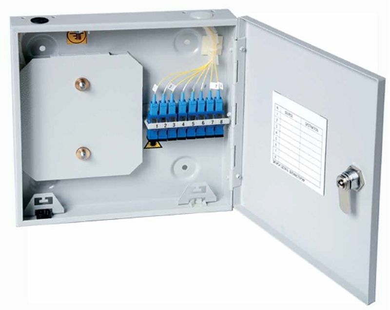Малогабаритный оптический кросс, с дверцей и замком, заглушками на кабельных вводах, с установленной сплайс-кассетой для разводки и укладки волокна.
