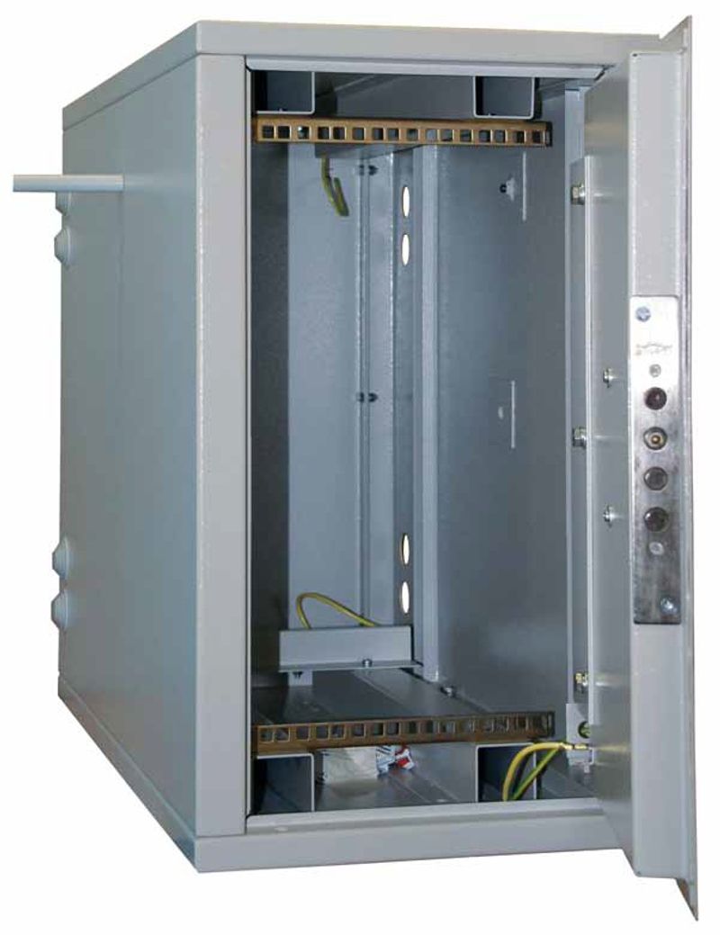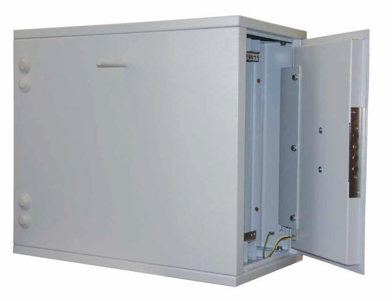Настенный 19” антивандальный шкаф с возможностью регулировки направляющих по глубине. Крепление по боковой стенке. Расположение оборудования внутри шкафа - вертикальное.